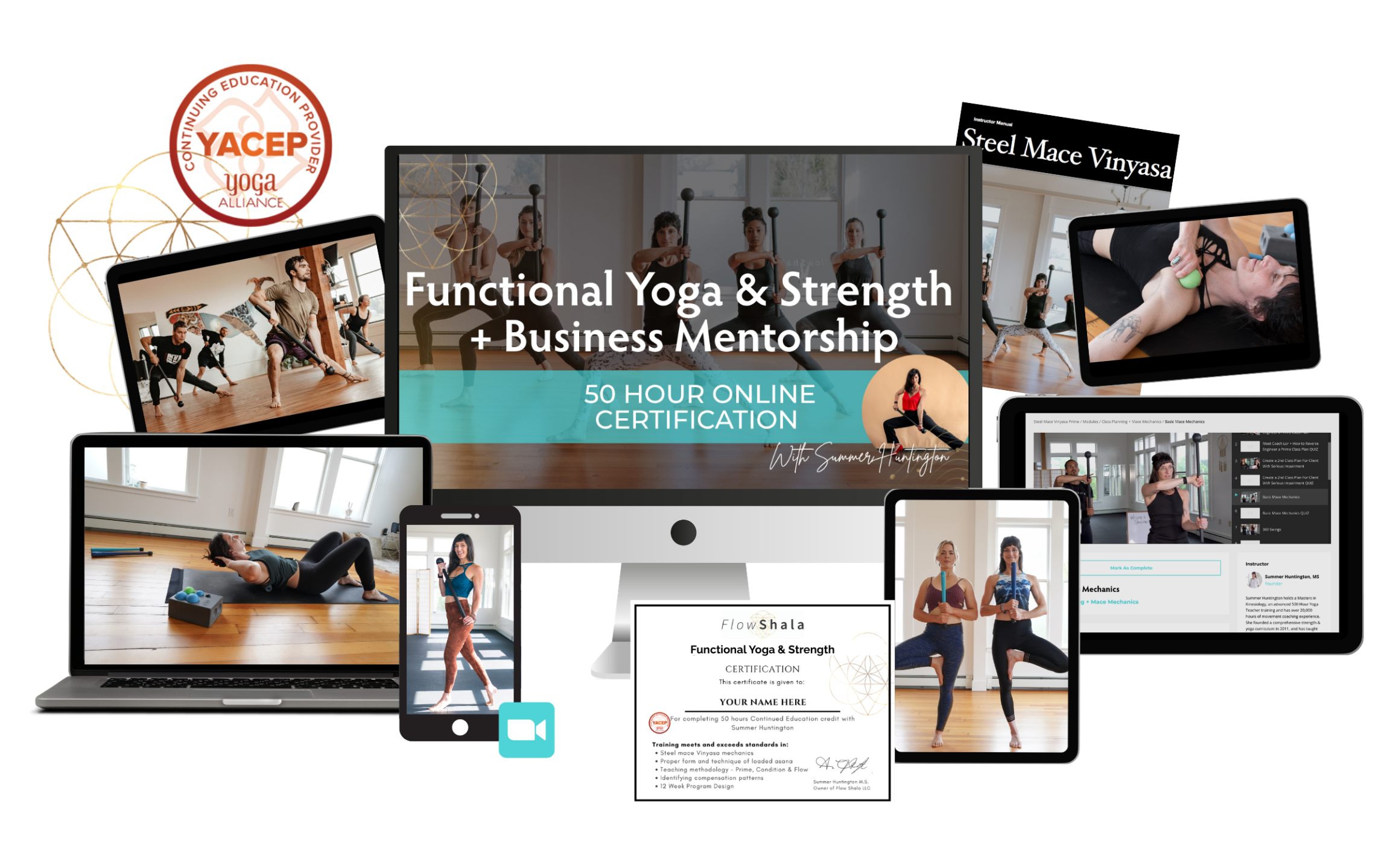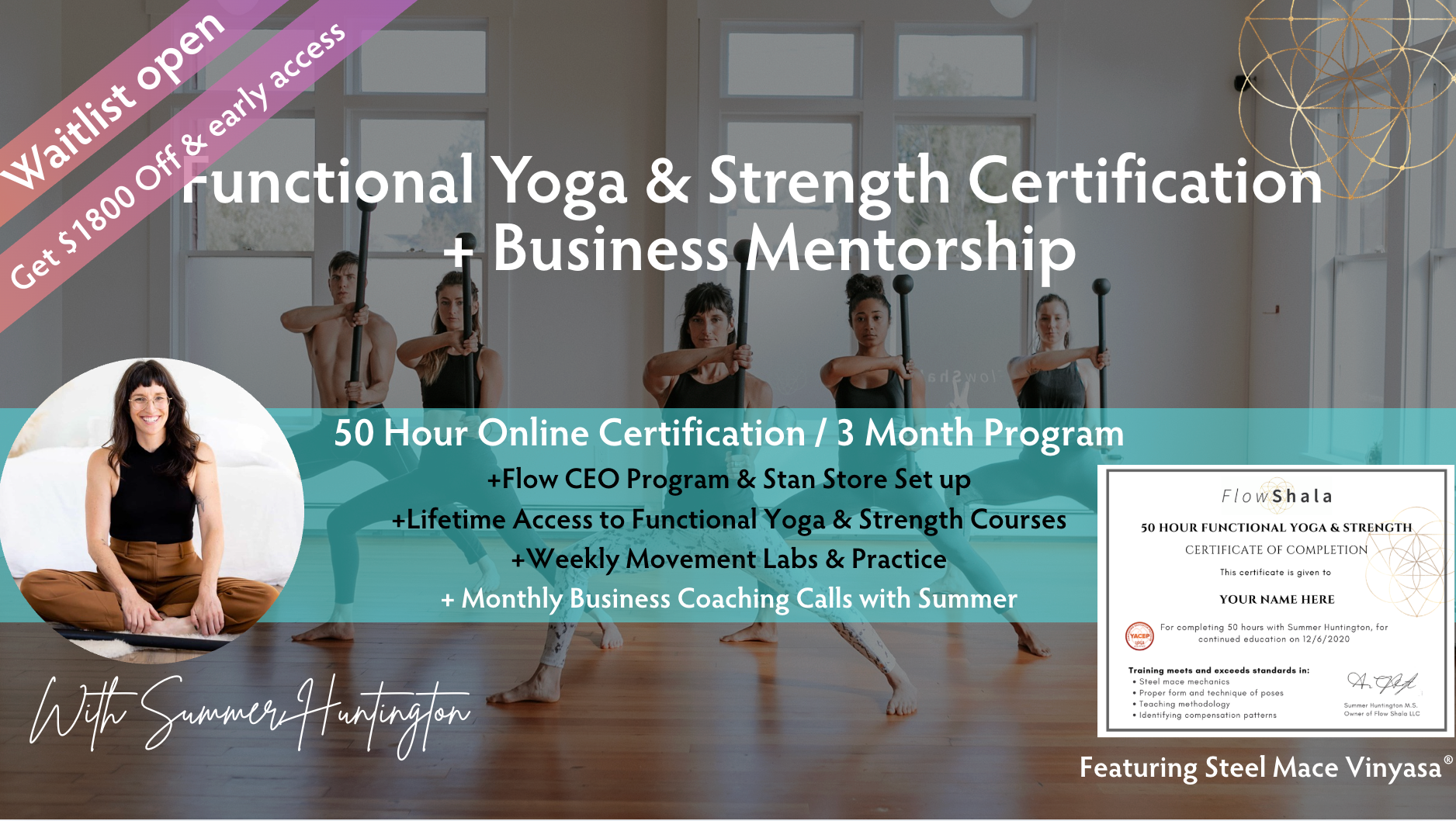 Summer Huntington, MS is an international yoga teacher with a masters in Kinesiology, Human Movement & Performance, and founder of Steel Mace Vinyasa & Flow Shala. She is sought after for her expertise in working with unconventional tools like clubs, steel mace and coaching Flow State. She is a Yoga Business coach for leaders who desire to build their “body of work” online, and has a strong background in digital marketing, content creation, and has published 16+ courses for her own Functional Yoga & Strength methods.Â